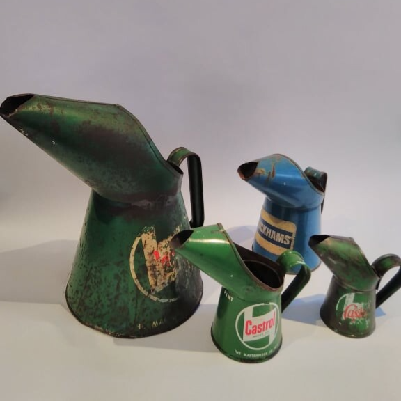 Below are a set of small oil cans used in Johnson's car repair garage.